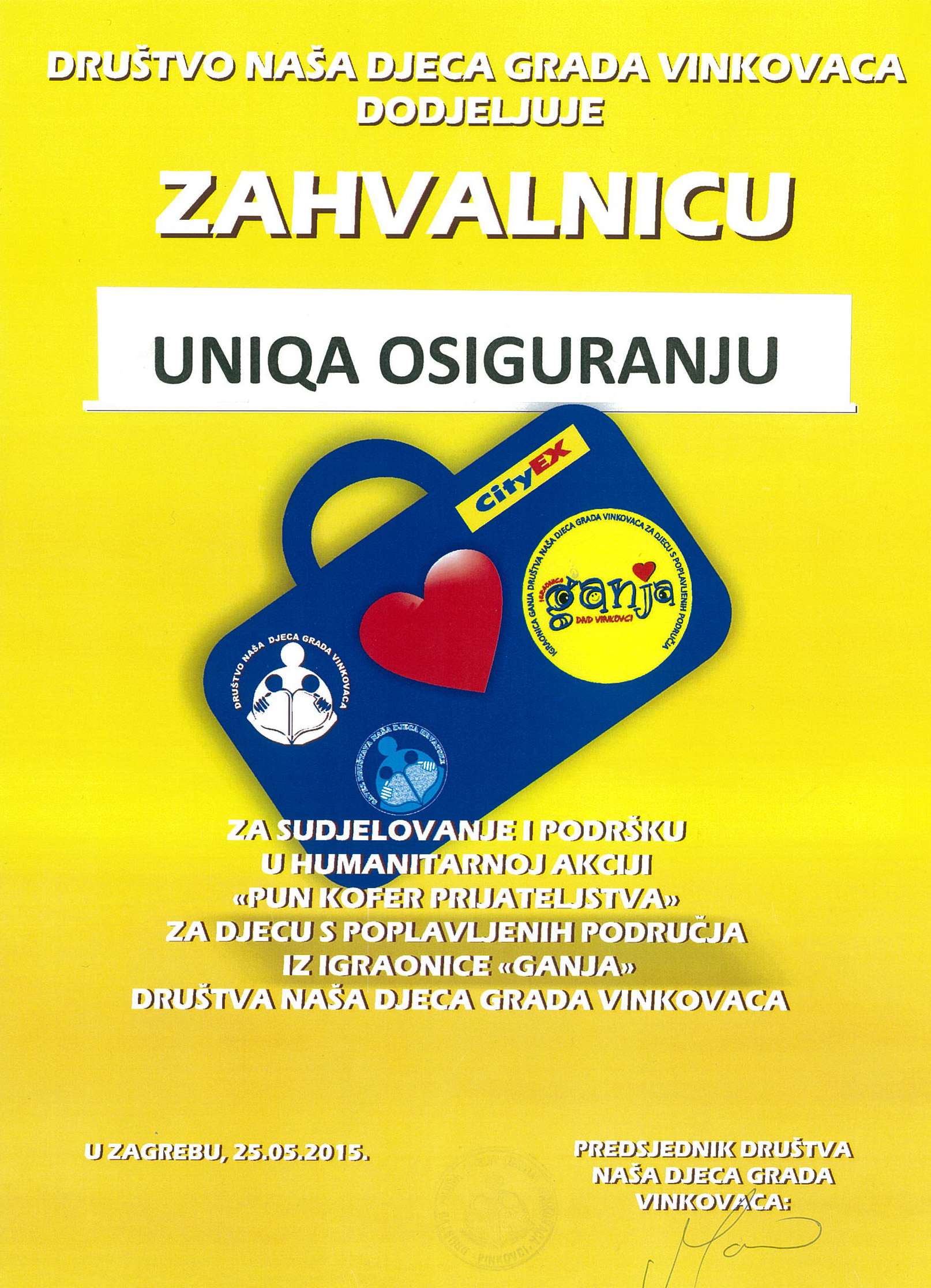 Društvo „Naša djeca Vinkovci“ organiziralo je akciju „Pun kofer prijateljstva“ koja je za cilj imala svakom djetetu s poplavljenih područja pružiti putnu torbu (kofer) s najosnovnijim osobnim stvarima za svaku priliku. S obzirom na to da se djeca i njihove obitelji nisu mogli vratiti kući nekoliko mjeseci, UNIQA je napunila nekoliko kofera s odjećom, obućom i ostalim potrepštinama kako bi olakšala život “malih ptica selica” do povratka njihovim domovima.